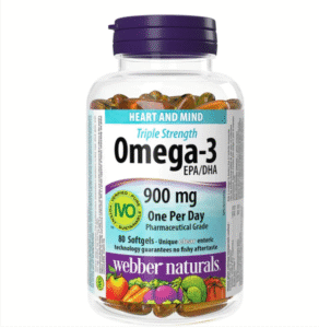 Webber Naturals Triple Strength Omega-3 900mg, 80 Ct supports heart health, brain function, and mood balance. Each softgel provides 900mg...