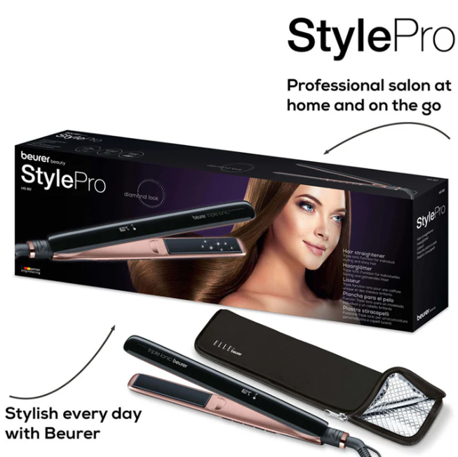 Style your hair like a pro with the Beurer Style Pro Hair Straightener HS-80. Featuring ceramic and titanium-coated plates, Triple Ionic Function, adjustable temperatures, and fast heat-up, it delivers smooth, shiny, frizz-free hair with salon-quality results at home.
