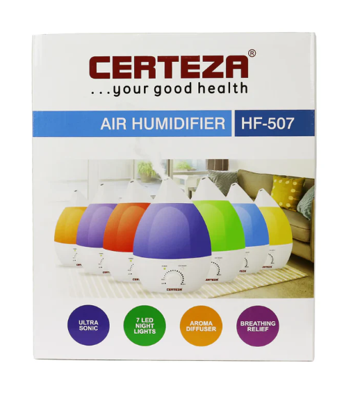 The Certeza Air Humidifier HF-507 delivers ultrasonic micro-fine mist for healthy, comfortable air in rooms up to 30m². Featuring 7-color LED lights, aroma diffusion, ultra-quiet operation, and a 2.8-liter removable water tank, it’s ideal for bedrooms and living spaces. Provides relief from dryness and allergies while maintaining optimal humidity levels.