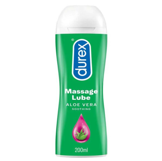 Durex Massage Lube Aloe Vera Gel, 200ml – A smooth, water-based 2-in-1 personal lubricant and massage gel infused with soothing Aloe Vera. Perfect for body massage, oral, vaginal, and anal intimacy. Easy to wash, gentle on skin, and compatible with Durex condoms.