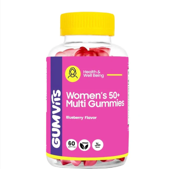 Delicious, Halal & Vegan Gumvits Women’s 50+ Multi Gummies provide essential vitamins and minerals to support energy, immunity, bone, muscle, eye, brain, and heart health for women over 50.
