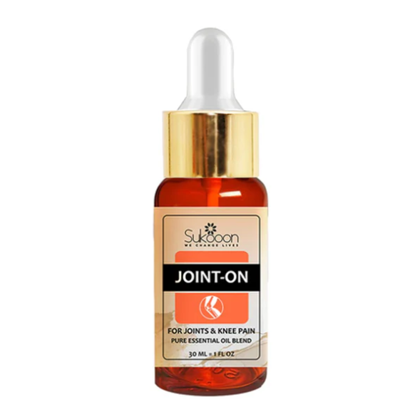 Joint On Essential Oil Blend for Joints & Knee Pain, 30ml – Sukooon is a 100% natural and organic oil formulation designed to relieve joint pain, stiffness, and inflammation. This powerful blend of essential oils and herbal extracts penetrates deep into the skin, improves blood circulation, and provides fast-acting relief for aching joints, knees, hips, shoulders, and back.