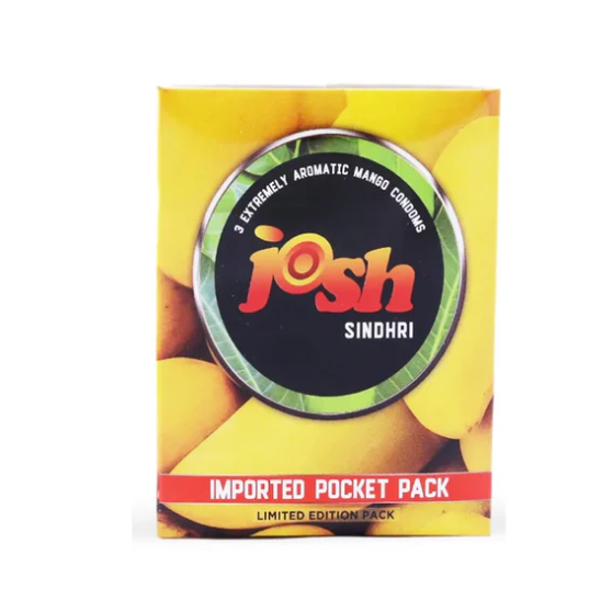 Enjoy safe and pleasurable intimacy with Josh Sindhri Aromatic Condoms (3 Ct). Mango-flavored, lubricated latex condoms with a smooth surface for enhanced comfort and reliable protection. WHO & ISO approved.