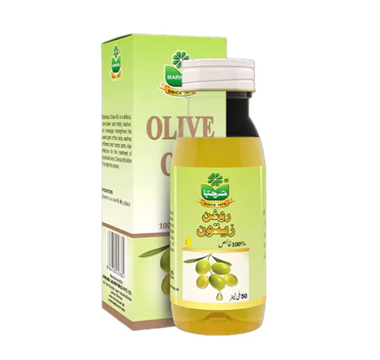 Marhaba Olive Oil 50ml is a pure and nutritious natural oil extracted from Olea Europea (olive fruit). Known for its demulcent and mildly laxative properties, this versatile oil helps strengthen weak body parts during massage, soothe inflamed or injured areas, and can also be used for healthy cooking. It is traditionally valued for its digestive and wellness benefits and may support relief in conditions like duodenal ulcers when used as advised by a physician.