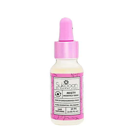 Experience natural relief with Misty Monthly Dose, 30ml – Sukooon, a premium essential oil blend designed to ease menstrual discomfort. Formulated with a soothing mix of Lavender, Peppermint, Cannabis, Cinnamon, and Rose oils, this gentle blend targets dysmenorrhea, abdominal bloating, and irregular or heavy periods.