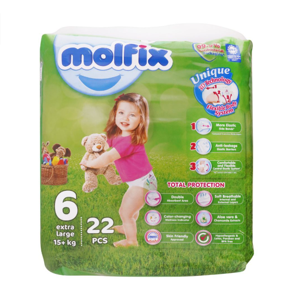 Molfix Diapers Size 6 (X-Large), 22 Count are thoughtfully designed to provide maximum comfort, dryness, and freedom of movement for active babies. Produced with utmost care, Molfix diapers are exceptionally gentle on your baby’s sensitive skin while offering reliable protection against leaks, day and night.