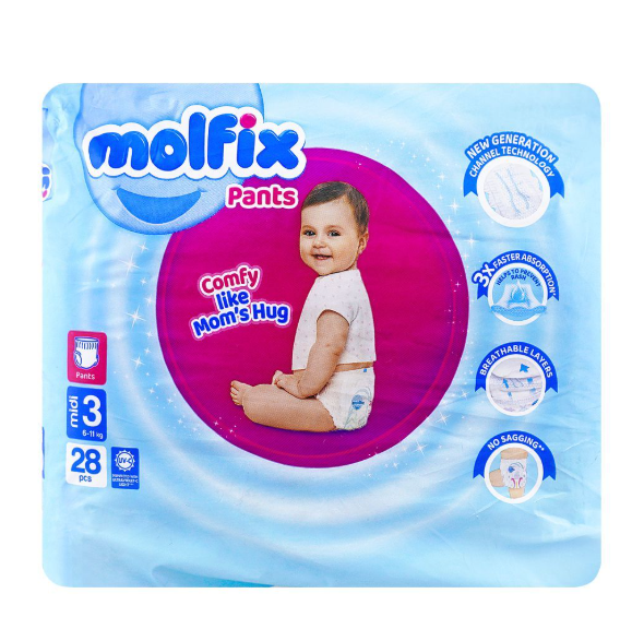 Ensure your baby stays dry, comfortable, and happy all day with Molfix Pants Size 3 (Midi), 28 Ct. Specially designed with your baby’s comfort in mind, these diapers feature Airsoft technology that keeps the skin soft while providing superior absorption. The color-changing wetness indicator lets you know when it’s time for a change, preventing irritation and discomfort.