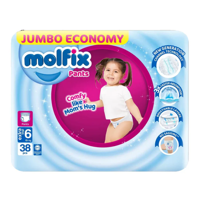 Keep your baby dry, comfortable, and happy with Molfix Pants Size 6 (Extra Large), 38 Ct. Features include double absorbent layers, anti-leak barriers, Aloe Vera & Chamomile extracts, and a color-changing wetness indicator for easy diaper monitoring.