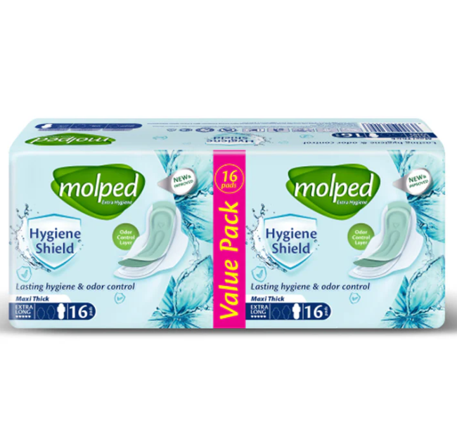 Molped Extra Hygiene Maxi ThinK Extra Long pads provide superior protection with extra-long, thick design for heavy flow days and overnight use. High-absorbency core, soft top layer, and odor-neutralizing technology ensure comfort, security, and lasting freshness. Pack of 16 pads.