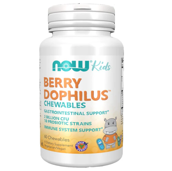 Support your child’s digestive and immune health with NOW Kids BerryDophilus Chewables Probiotic, 60 Ct. Each chewable delivers 2 billion CFU from a potent blend of 10 clinically validated probiotic strains, including Lactobacillus acidophilus, Bifidobacterium lactis, and Lactobacillus rhamnosus, designed to promote healthy intestinal flora and enhance nutrient absorption.