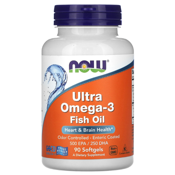 High-potency NOW Ultra Omega-3 Fish Oil 750mg with 500 EPA / 250 DHA per softgel. Enteric-coated and odor-controlled for easy digestion. Molecularly distilled, tested for purity, Halal certified, and free from heavy metals. 90 softgels per bottle.