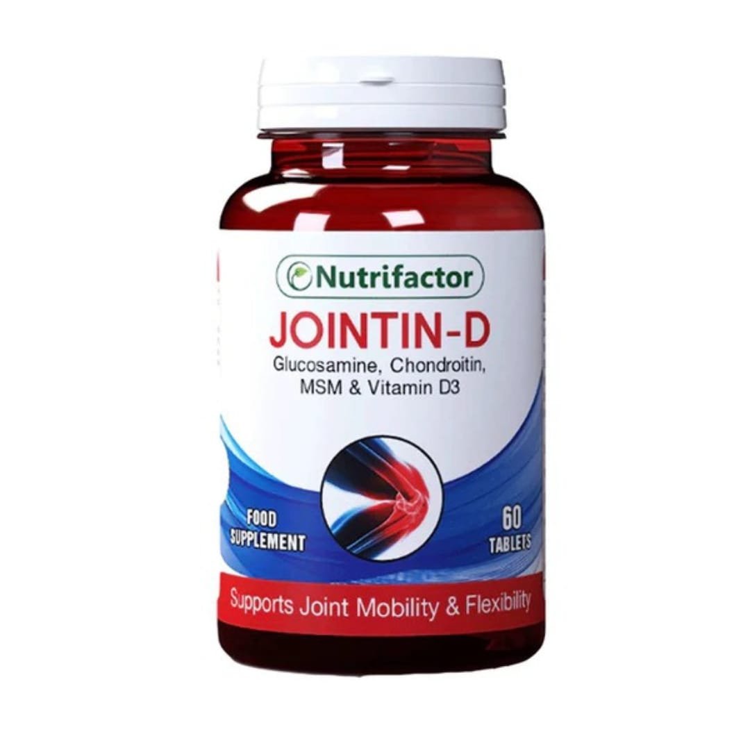 Nutrifactor’s Jointin-D is a premium joint care supplement designed to maintain flexibility, comfort, and strength in the joints. It combines scientifically backed ingredients like Glucosamine Hydrochloride and Chondroitin Sulfate, which help rebuild and regenerate damaged cartilage. MSM (Methylsulfonylmethane) delivers sulfur to the body, supporting connective tissue repair and reducing chronic pain. Hyaluronic Acid adds lubrication between joints, ensuring smooth movement and acting as a natural shock absorber.