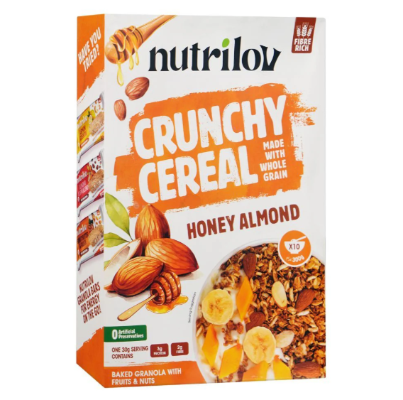 Nutrilov Crunchy Cereal Honey Almond 300g is a delicious blend of whole grain oats, real honey, and crunchy almonds. Packed with 3g protein and 2g fibre, it’s perfect with milk, yogurt, or as a healthy snack on the go.