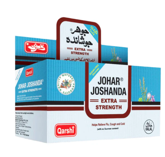 Experience natural relief with Qarshi Johar Joshanda with Sugar-Free, 30 Ct, a trusted herbal tea blend designed to combat flu, cough, cold, throat irritation, catarrh, and mild fever. Each 5g sachet is packed with the goodness of carefully selected herbs like Liquorice Extract, Vasaka, KhashKhash, Maiden Hair Fern, Hyssop, and Ephedra, ensuring a soothing and aromatic experience with every sip.